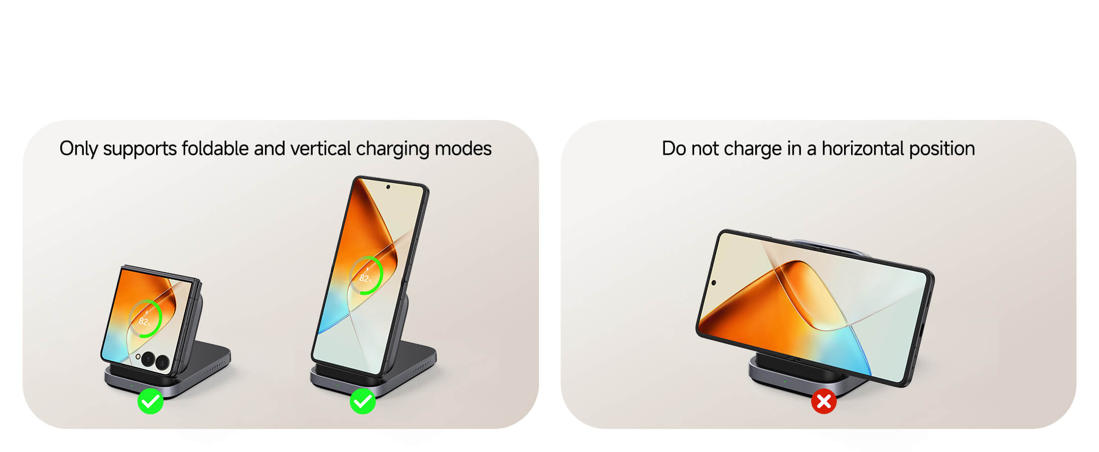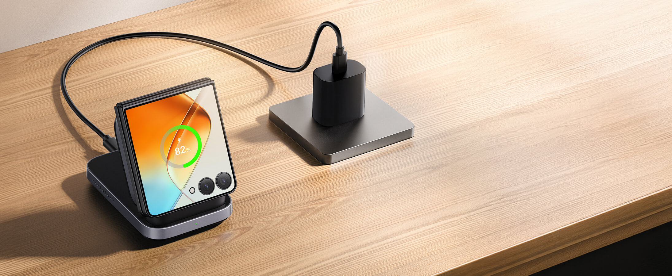 • Лесно и удобно зареждане: Започва да зарежда мигновено, независимо дали телефонът е сгънат или изправен; за най-добра производителност използвайте 18W адаптер.