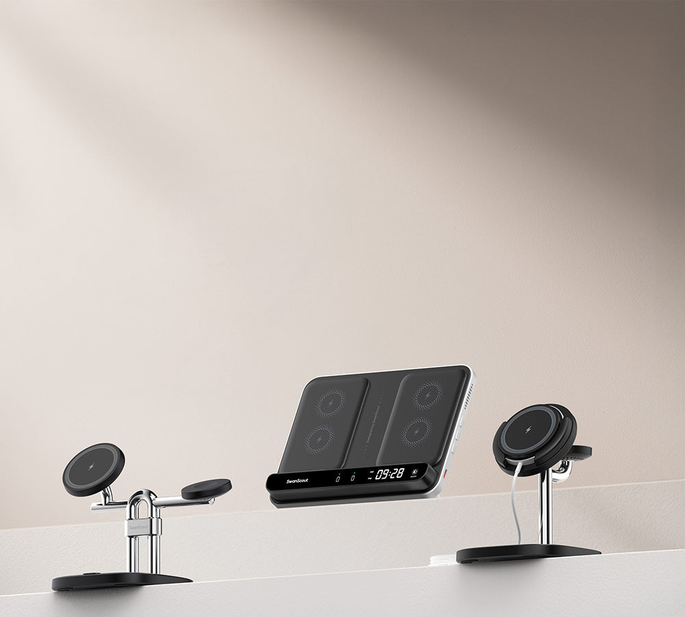 SwanScout 708SM - 3 v 1 magnetická bezdrátová nabíječka pro Samsung s hodinami