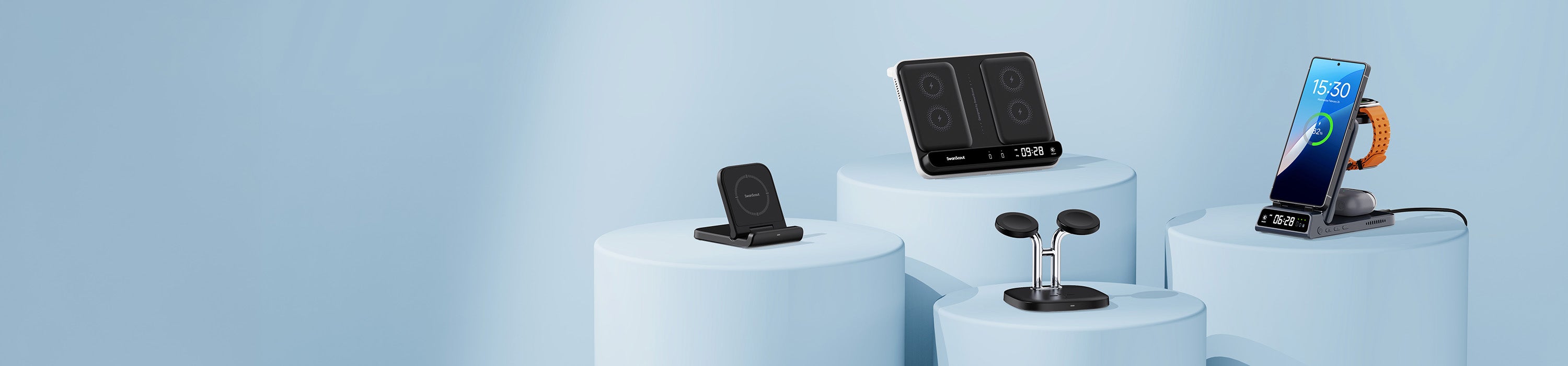 Společnost SwanScout nabízí řadu bezdrátových nabíječek přizpůsobených uživatelům Samsungu, od kompaktních zařízení 3 v 1 pro jednotlivce až po modely pro dva telefony a hodinky pro domácnosti. Tyto nabíječky, určené pro osobní i sdílené prostředí, umožňují současné nabíjení více zařízení, minimalizují čekací doby a maximalizují efektivitu.