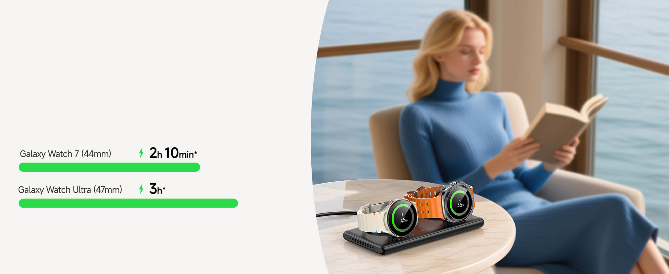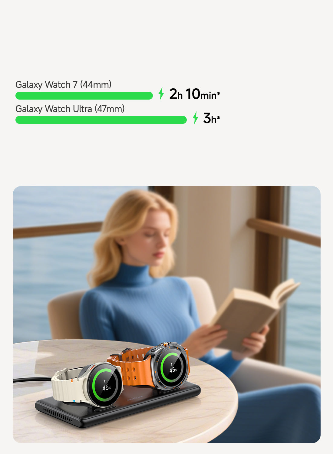 • 안정적인 3W 출력을 제공하며, Galaxy Watch7 (44mm)을 약 1시간 내에 50%까지 충전합니다.