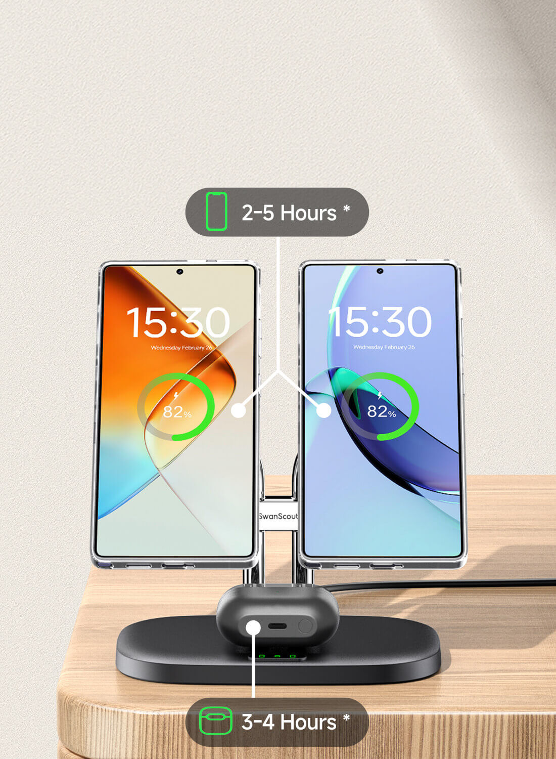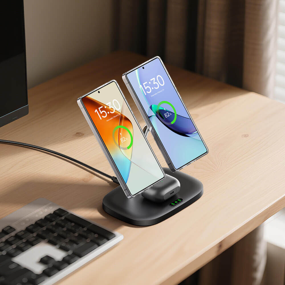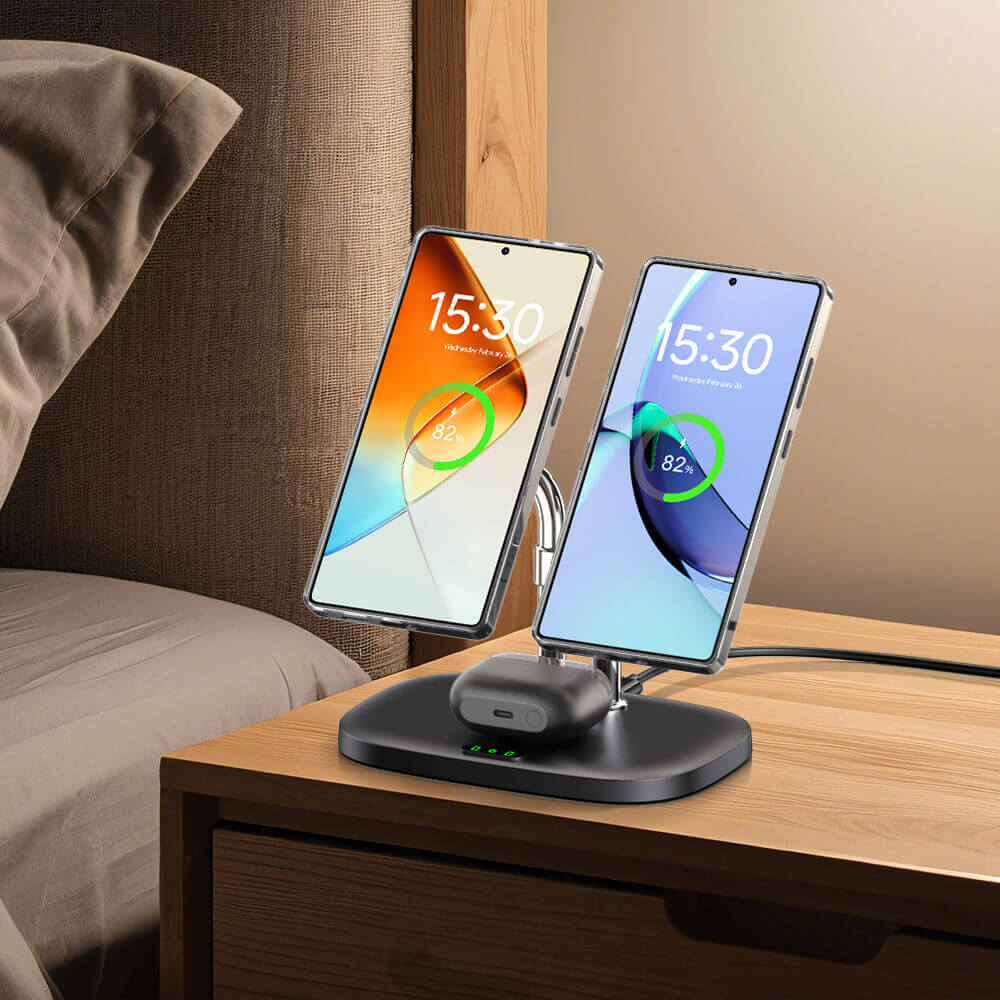 • 듀얼 자기 충전: 강력한 자석으로 두 대의 휴대전화를 동시에 충전할 수 있어 커플, 다중 기기 사용자, 개인 및 업무용 전화기를 동시에 관리하는 사람에게 적합합니다.