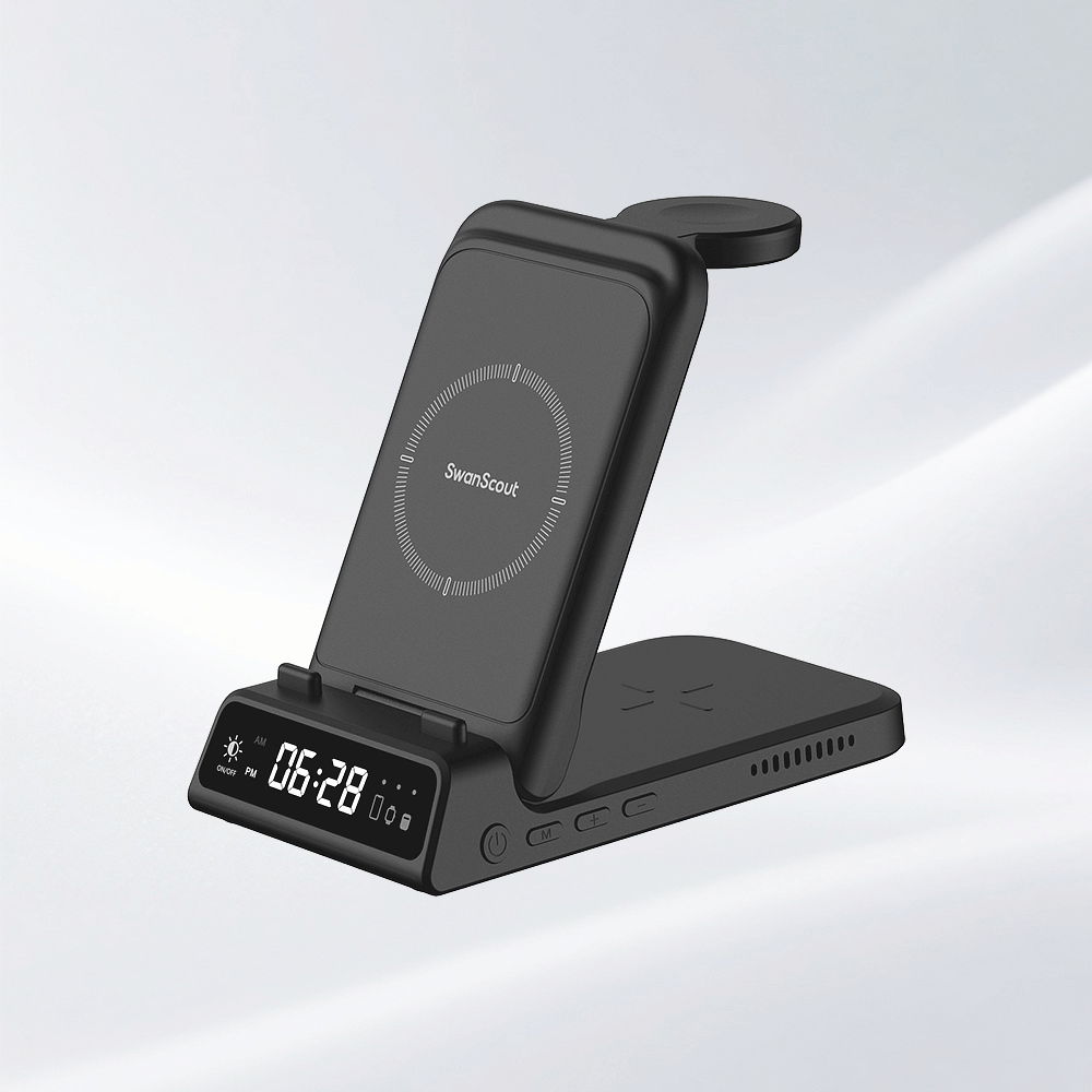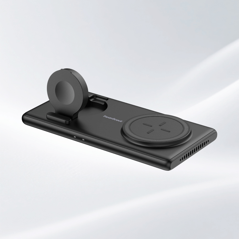 A estação de carregamento 3 em 1 da SwanScout é compatível com dispositivos que não sejam da Apple e compatíveis com as normas de carregamento sem fios (por exemplo, telemóveis Android selecionados e auscultadores sem fios) nas áreas para telemóveis e auscultadores, mas a área para relógio é exclusiva do Apple Watch. Para carregamento magnético, os dispositivos anteriores ao iPhone 12 requerem compatibilidade magnética ou uma capa magnética.