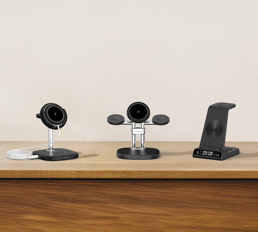 Ładowarki domowe i biurowe SwanScout do urządzeń Apple to inteligentne i wydajne rozwiązanie do ładowania w domach. Kompaktowa stacja 3 w 1, idealna na stoliki nocne lub powierzchnie w salonie, efektywnie zasila iPhone'a 17, Apple Watch Series 10 i AirPods Pro. Precyzyjne magnetyczne ustawienie obsługuje iPhone'a serii 12-17, a technologia niskiego promieniowania i regulowane wskaźniki LED zapewniają bezpieczeństwo i komfort w nocy, idealnie dopasowując się do nowoczesnych potrzeb domowych.