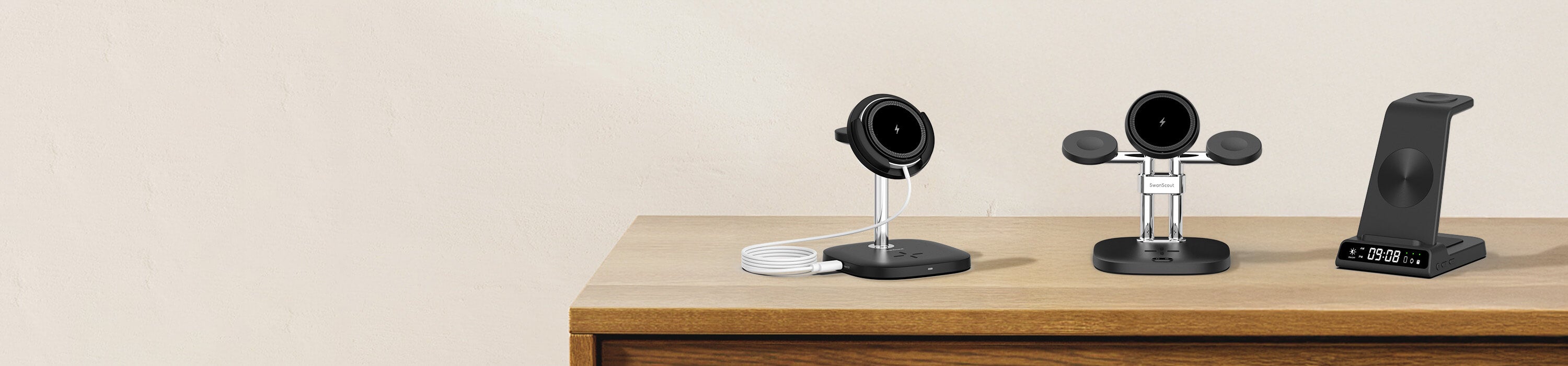 SwanScoutの3-in-1充電ステーションは、スマートフォンとイヤホンの充電エリアでは一部のAndroidスマートフォンやワイヤレスイヤホンなど、Qi2対応のApple以外のデバイスにも対応していますが、Apple Watchの充電エリアはApple Watch専用です。最適なパフォーマンスを得るには、モデルごとの互換性情報をご確認ください。