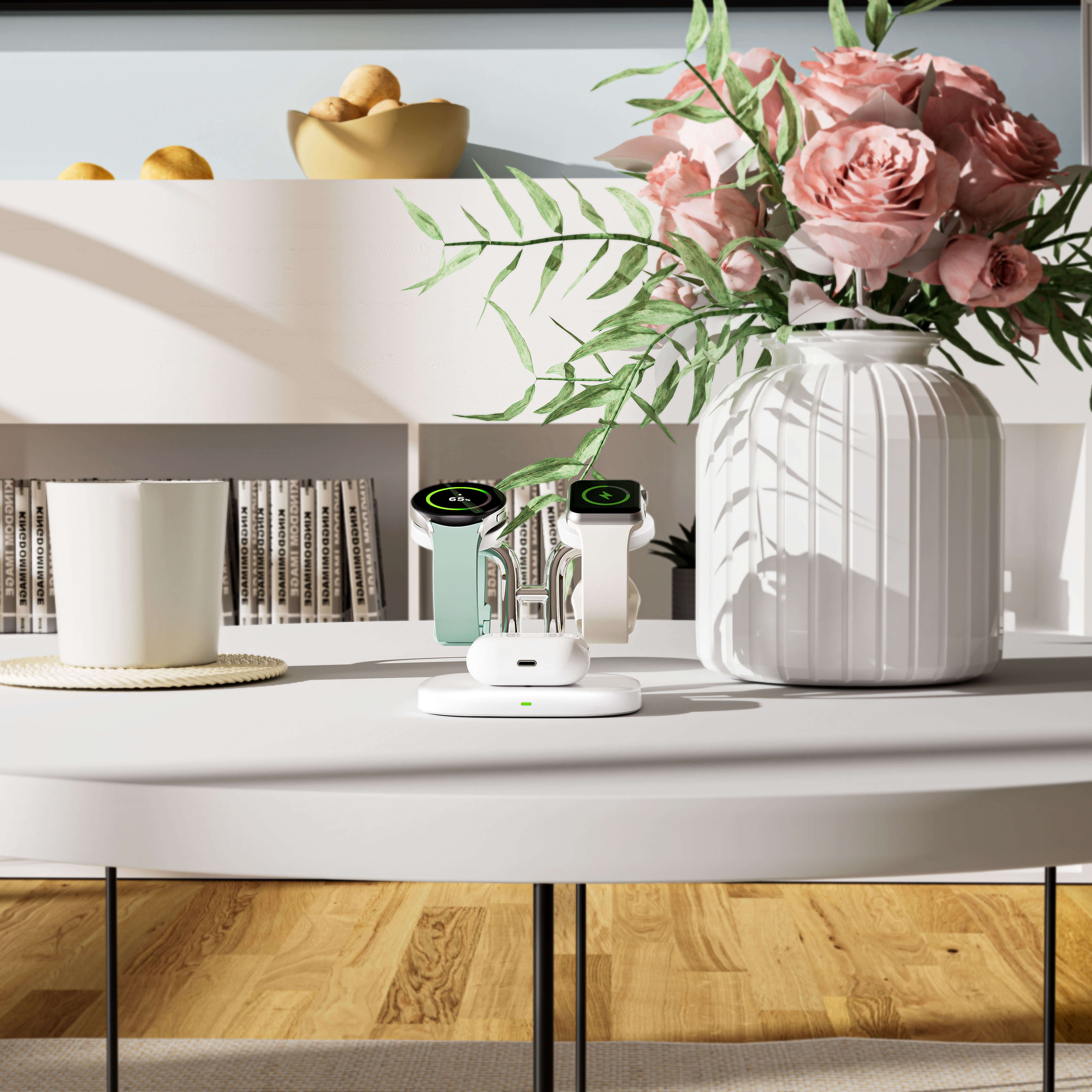 • Design 3 em 1: Carrega simultaneamente um Apple Watch, um Galaxy Watch e fones de ouvido sem fio, oferecendo energia confiável para viagens, uso ao ar livre ou rotinas diárias.