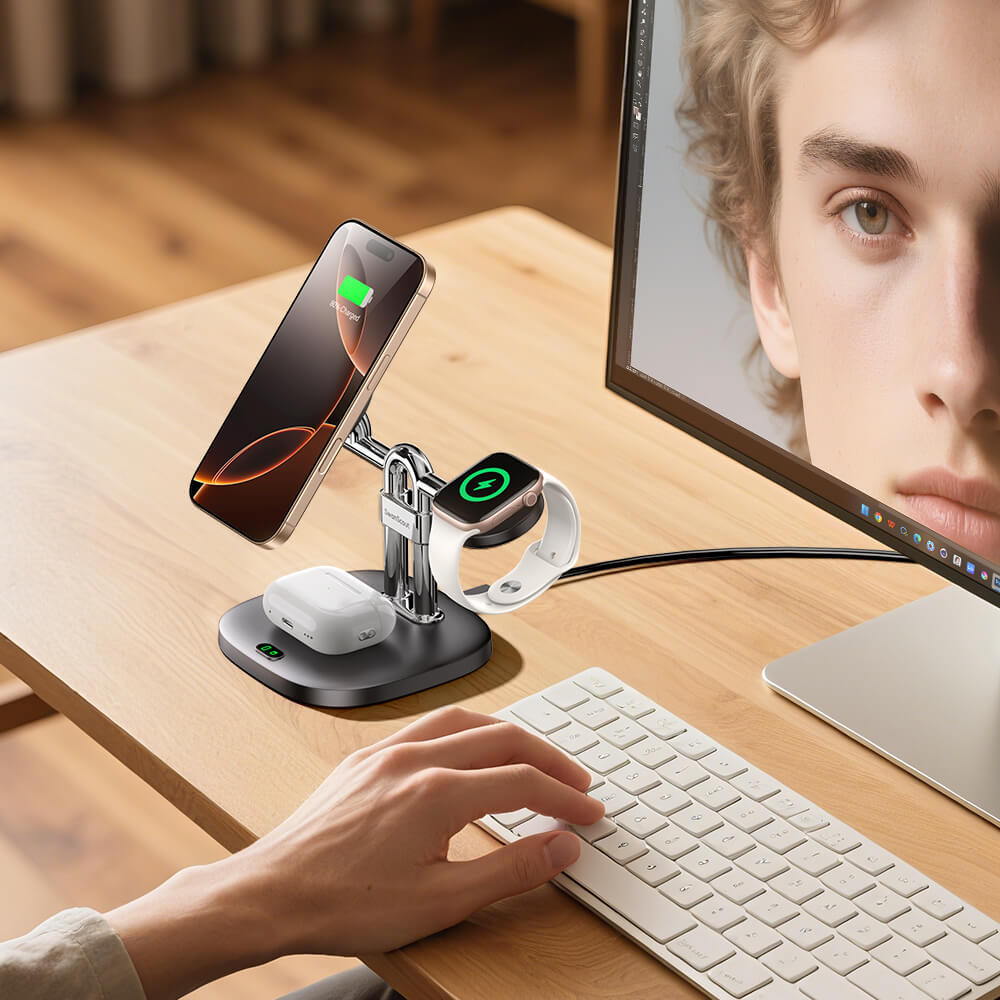• Încărcați simultan iPhone, Apple Watch și AirPods cu MagSafe și încărcare wireless, menținând spațiul ordonat și fără cabluri.