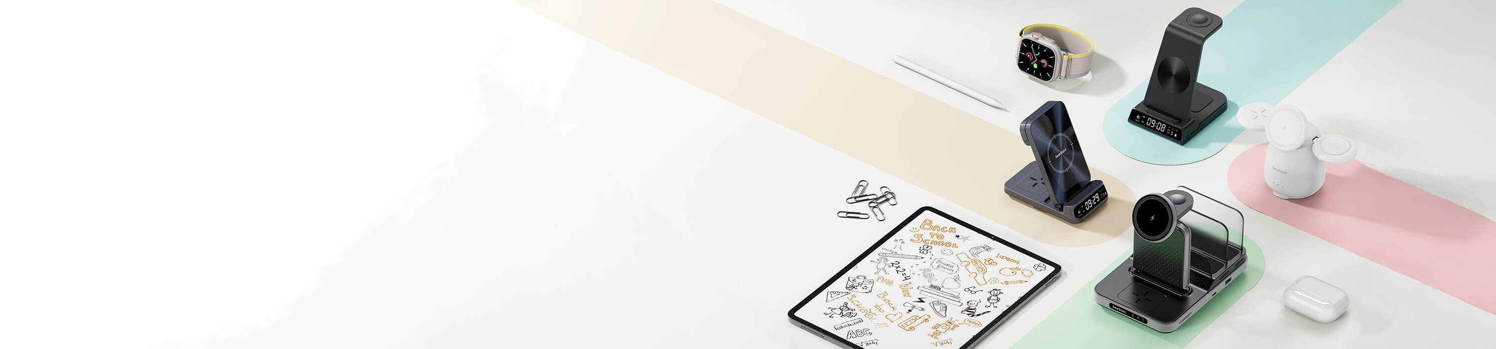 Skrivbord är ofta trånga, och flera laddare med kablar gör bara röran och stressen värre. SwanScouts 3-i-1 och dubbla trådlösa laddare samlar alla dina enheter i en snygg och kompakt lösning som hjälper dig att hålla din studieplats organiserad, effektiv och redo för fokus.