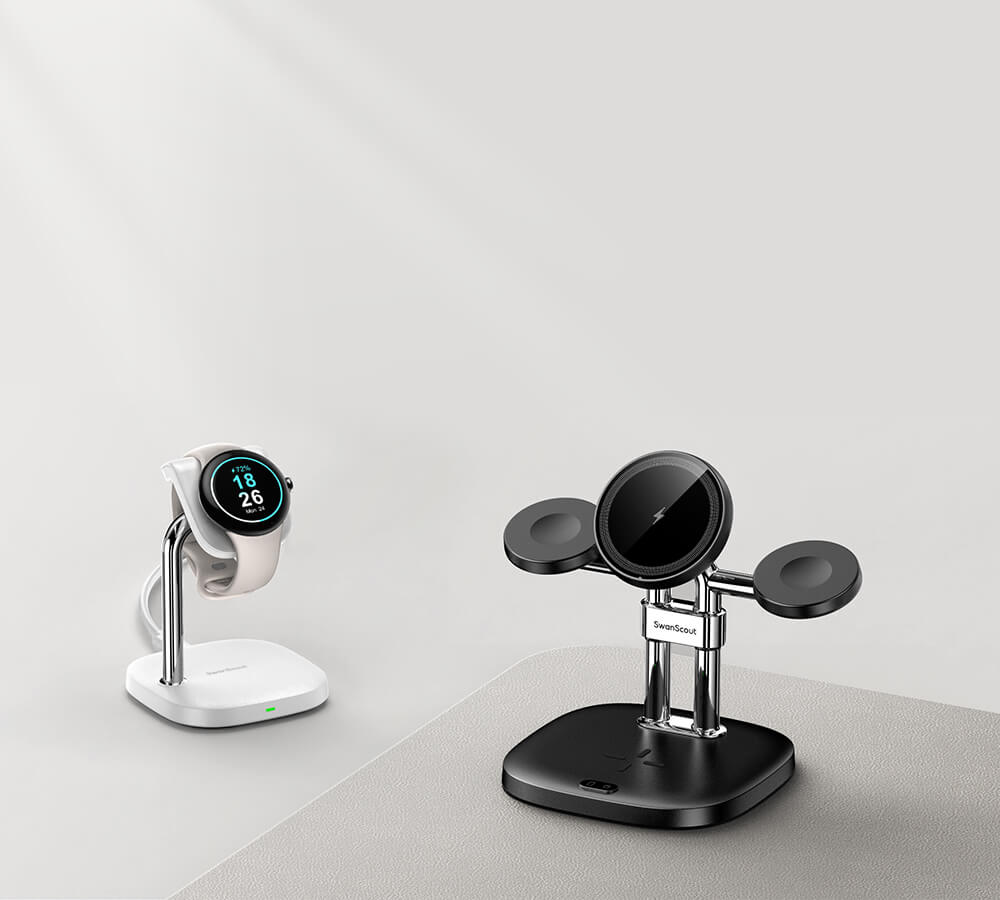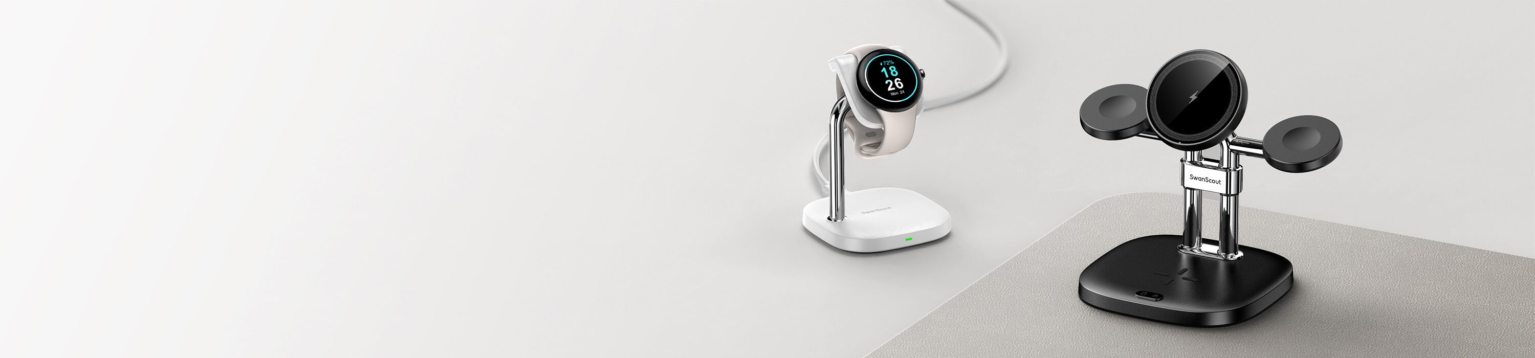 SwanScout 充电器配备耐用的金属支架,无论垂直或水平放置,都能稳固地支撑您的手表和其他设备,确保稳固不滑落。精心设计的支架不仅提升了易用性,还能有效防止意外跌落和损坏,带来无忧的充电体验。