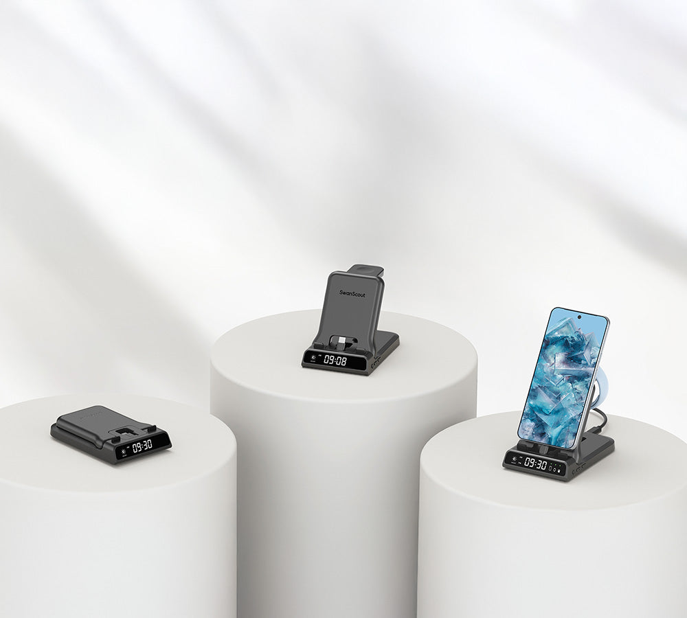 节省 20% SwanScout 701A is a 3-in-1 wired fast charger compatible with Apple phones, watches, and earbuds, offering stable and efficient charging in one sleek unit.The swanscout 701A is a stylish alarm clock with cell phone charger, combining fast charging with a digital time display for added convenience.
