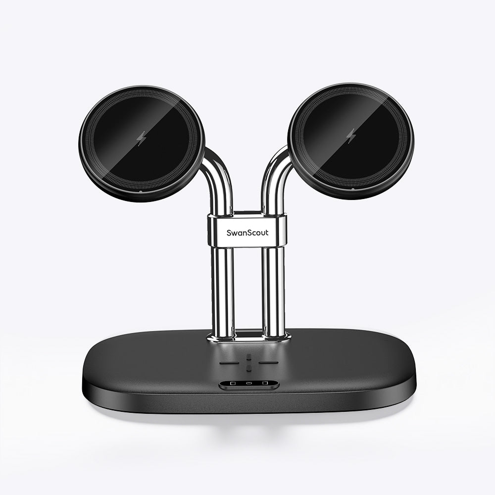 SwanScout 502M is a slim, 2-in-1 magnetic wireless charger compatible with Apple devices.The SwanScout 502M combines a sleek 2 in one clock phone charger design with an LED display and fast charging for daily convenience.