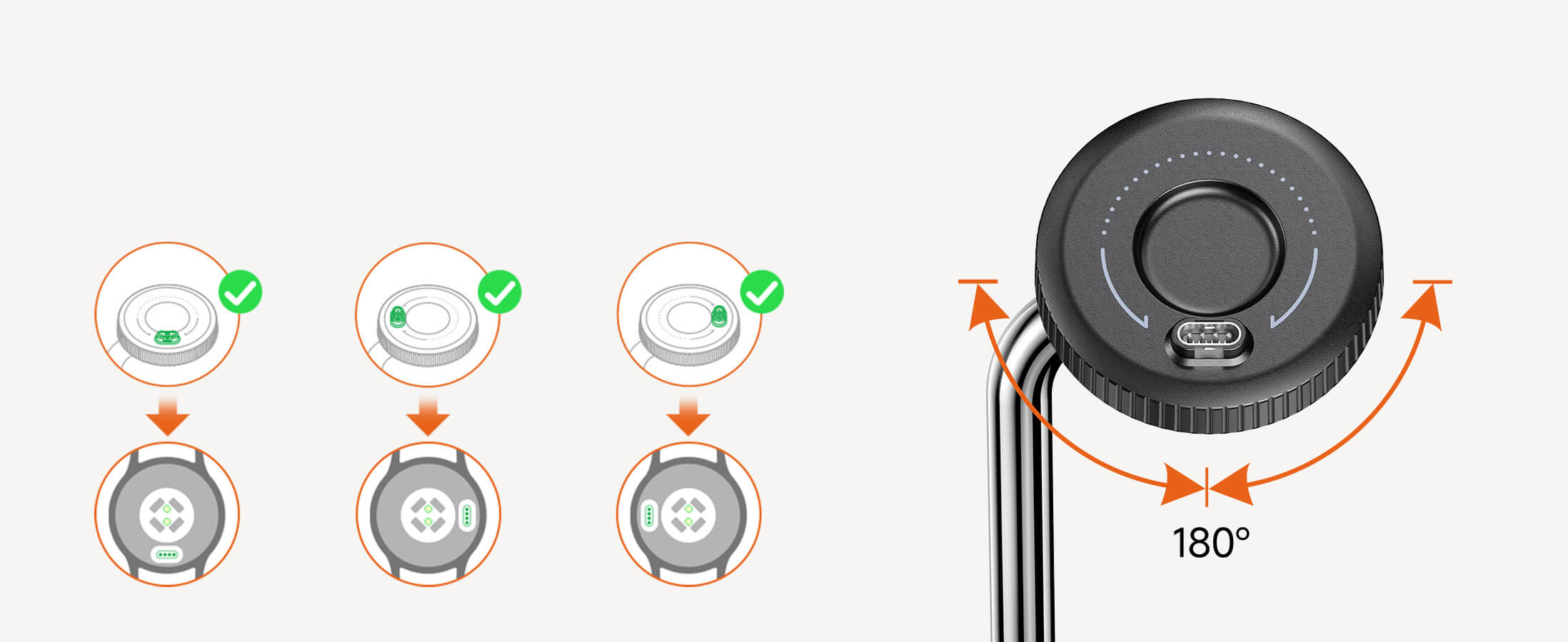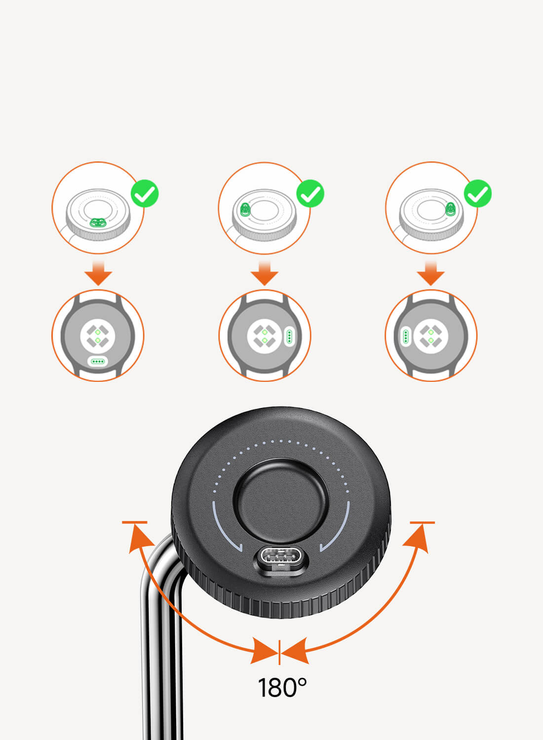 Some Garmin watches have the charging port on the left side, and some on the right (I have both types), and the round puck can be rotated to place the charging plug to either side. It rotates smoothly, but clicks into place when the plug is on the left, right, and also center (bottom). They thought of everything!